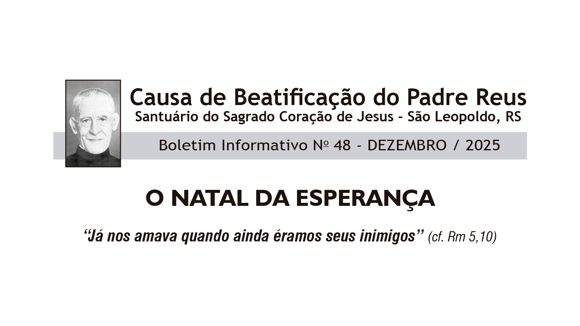 A edição nº 48 do Boletim da Causa da Beatificação do Padre Reus traz, na abertura, o artigo O Natal da Esperança, escrito por dom João Francisco Salm, bispo de Novo Hamburgo (RS). A publicação apresenta também graças alcançadas por intercessão do Pe. Reus, atualizações sobre o andamento do processo de beatificação e a programação de 2026 do Santuário do Sagrado Coração de Jesus, em São Leopoldo (RS).