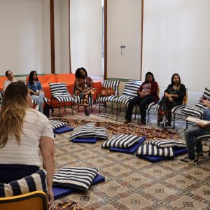 Na oficina Música Decolonial, o professor de Geografia Thiago Villela conduziu uma vivência sensorial sobre a musicalidade africana, envolvendo momentos de escuta atenta e reflexão.
