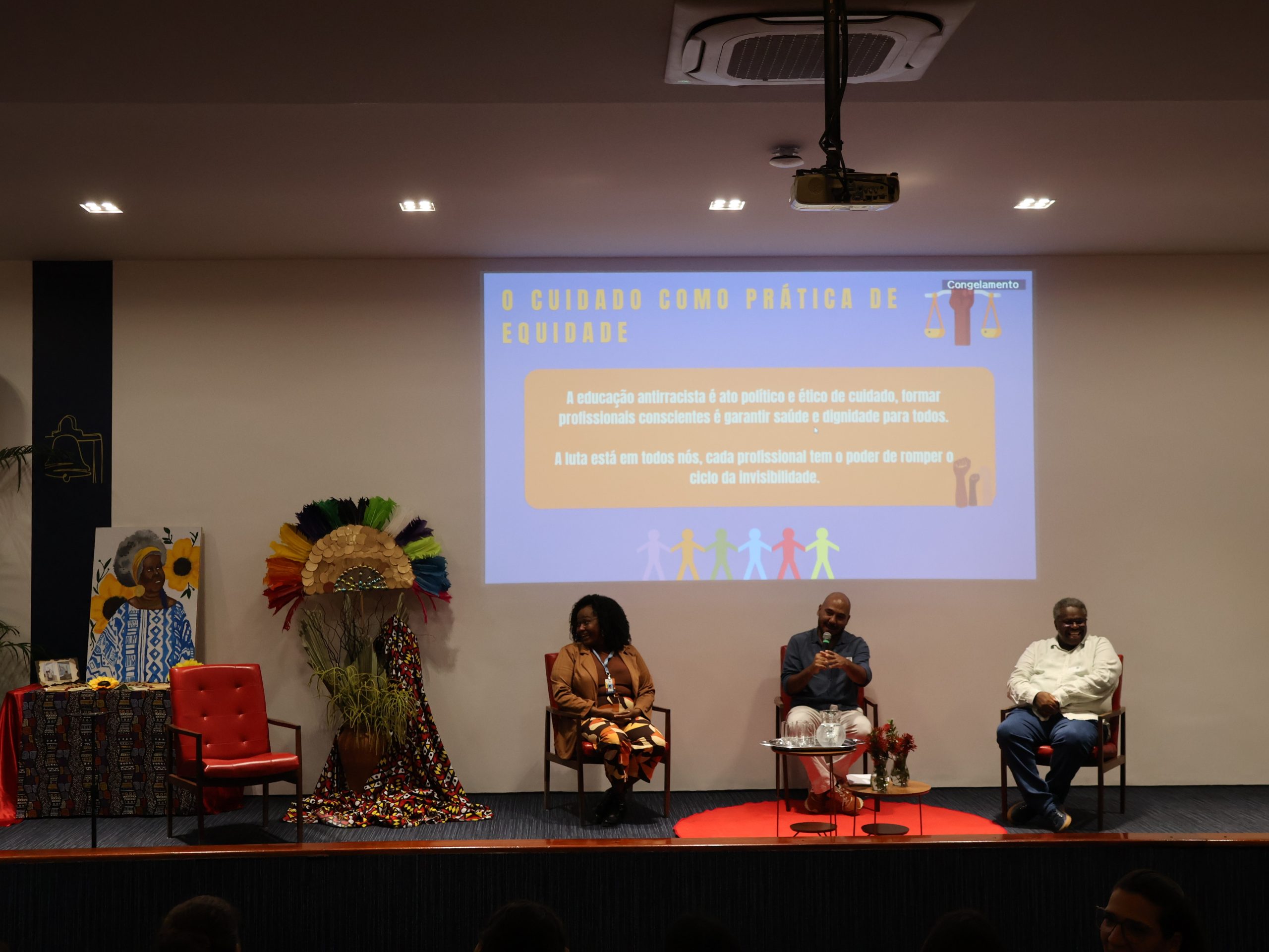 Ainda na parte da manhã, foi realizada uma mesa-redonda com mais dois convidados além de Fábio: Thales Vieira, diretor do Observatório da Branquitude e especialista em Equidade Racial, e Alessandra Rachel Gomes, professora do curso técnico de Enfermagem do CSI.