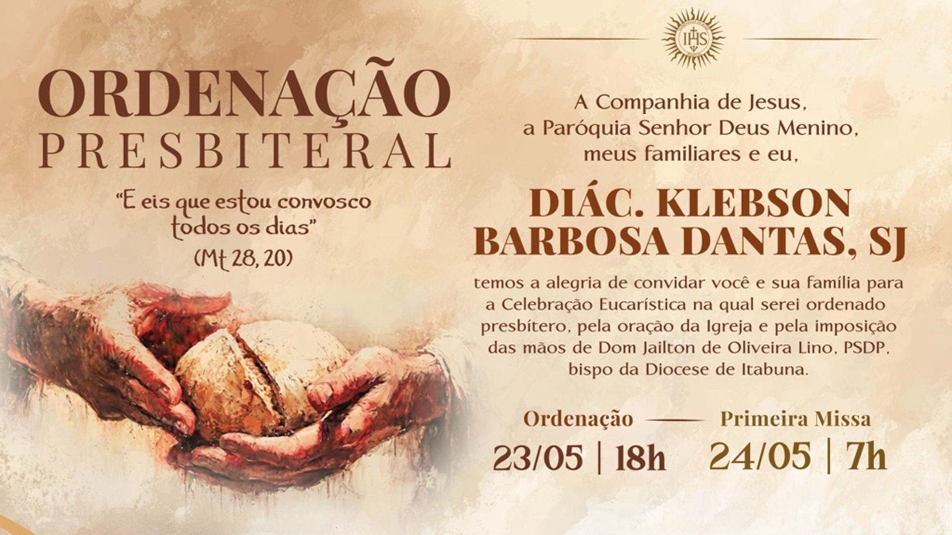 A Província dos Jesuítas do Brasil tem a alegria de convidar para a ordenação presbiteral do Diác. Klebson Barbosa Dantas, SJ.