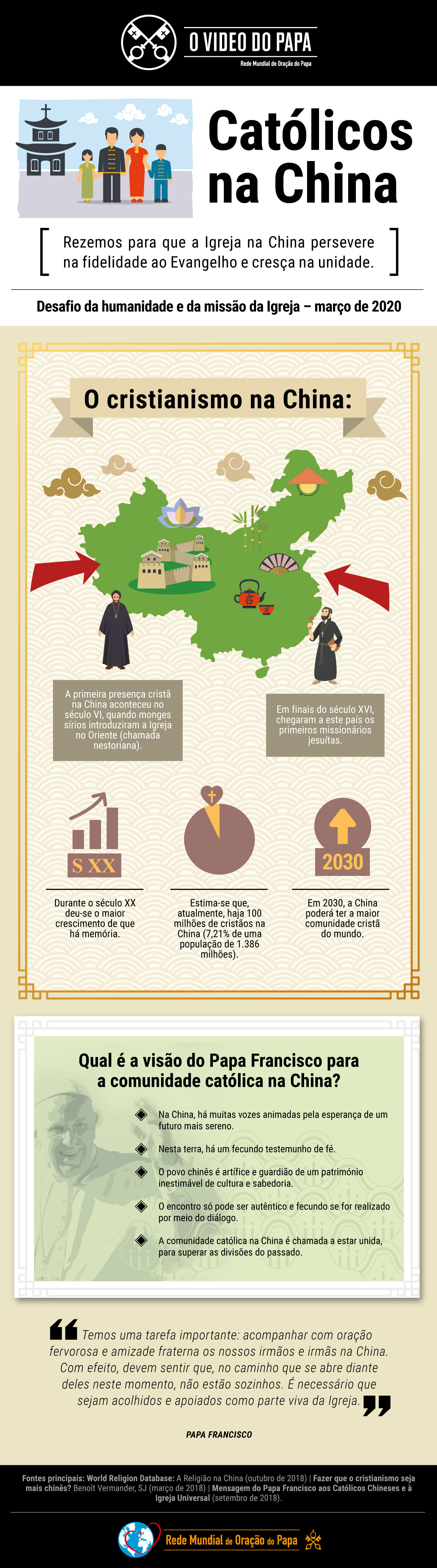 Em O Vídeo do Papa de março, divulgado pela Rede Mundial de Oração do Papa, as intenções de oração são direcionadas à comunidade cristã na China,  onde “a Igreja olha para o futuro com esperança”, diz o Pontífice, na mensagem publicada na última quinta-feira (5/3). O intuito de Francisco é que os fiéis católicos do país “perseverem na fidelidade ao Evangelho e cresçam na unidade”.