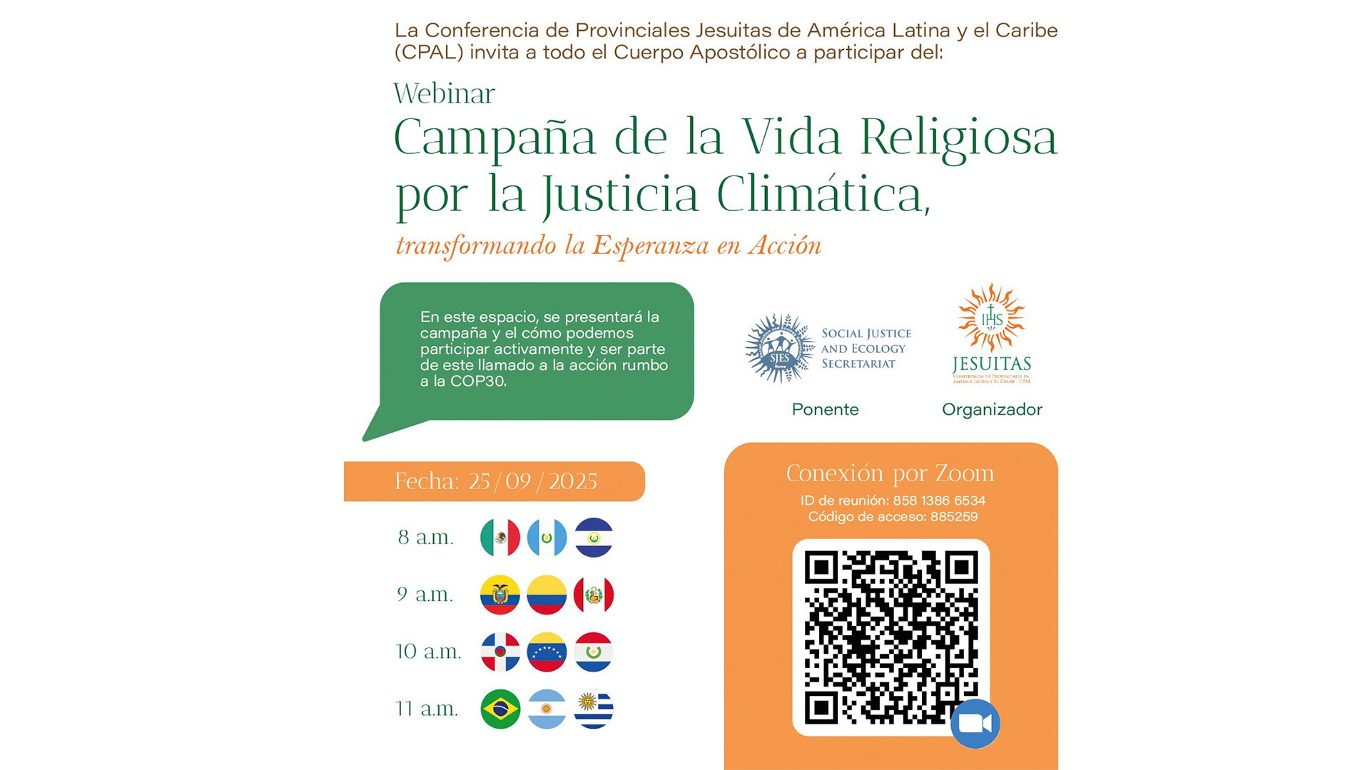 A Conferência dos Provinciais Jesuítas da América Latina e do Caribe (Cpal) convida o corpo apostólico da Companhia de Jesus a prestigiar o webinar Campanha da Vida Religiosa pela Justiça Climática: transformando esperança em ação. Além de apresentar a iniciativa, o Secretariado de Justiça Social e Ecologia da Companhia de Jesus (SJES) explicará como participar ativamente e fazer parte deste chamado ao movimento que antecede a COP30.