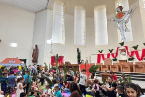 Na tarde de sábado (12), as famílias de São Leopoldo (RS) vivenciaram uma verdadeira experiência de catequese no Santuário Padre Reus (Sagrado Coração de Jesus). Durante a Missa com Crianças — que reuniu cerca de 300 participantes mirins, acompanhados por pais e familiares — uma encenação especial narrada por fantoches trouxe à cena a entrada triunfal de Jesus em Jerusalém, representado por uma criança caracterizada e montada em um pônei.