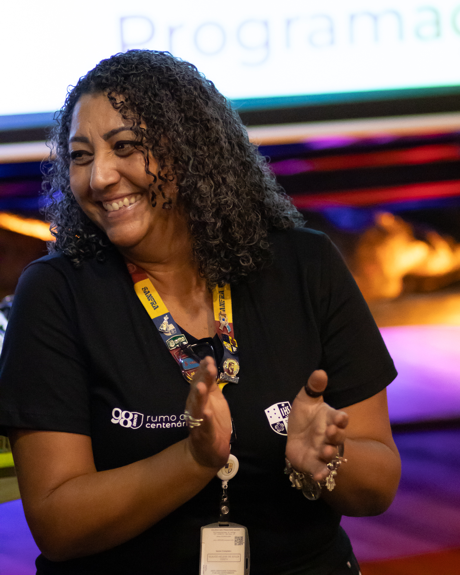 Encerrando esse bloco de reflexões pedagógicas, a professora e pesquisadora Lavini Castro, referência nacional em educação antirracista, provocou o grupo a pensar o colégio como espaço de formação comprometido com justiça, equidade e transformação social, fortalecendo o caminho do Sanfra na construção de uma educação antirracista.