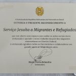O Serviço Jesuíta a Migrantes e Refugiados (SJMR Brasil) recebeu no dia 19 de dezembro uma homenagem da Embaixada da Venezuela. O reconhecimento foi concedido em agradecimento por todo o apoio dado aos venezuelanos nos últimos anos no Brasil e por apoiar as iniciativas realizadas pela Embaixada.